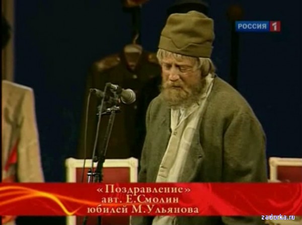 Текст миниатюры Хазанова "Поздравление" На силу дошёл. Вообще-то вы знаете, Ленин против бедности выступал. Бывало догонит на улице нищего, поднимет ему капушон и крикнет "Бог подаст!". Но я вот сегодня ходок, провинциальных театров российских. Конечно, нонче, не все артисты такую плохоньку одежонку носят. У некоторых и этого нету. У нас щас в провинциальных театров в России как по всей стране население делится на две категории. На крутых и всмятку. Так вот я от вторых. Щас пойду туда, всё ему расскажу, если дослушает. Прям приду и скажу: Товарищ Ульянов, ужас, одно слово. И всё. Ужас как живем, товарищ Ульянов. Кулаки замучали. Замучали кулаки. Прям чешутся всё время! Всё время кому-нибудь хочется крест на имидже сделать. Зарплату получаем полгода, неповерите чем, мизансценами. Потому что эти гроши, даже деньгами не назовешь. На них можно играть только одну пьесу - "живой труп". И не знаю что и делать. Народ, товарищ Ульянов, в театр не ходит. Совсем не ходит. Что мы только не делали, название меняли, прям такую рекламу дали, "Спектакль для молодежи - Хабалка Мон Мартра". Ни одна хабалки не пришла. На крайнюю меру пошли, написали новое прочтение комедии Бомарше "Безумный гений или женитьба Пидора". Опять никого! Но у нас в провинции и на рекламу артистов на зовут. Это же очень опасное дело реклама для артиста! Вот случай такой был, одна артистка другой "Ариэль" подсовывала. Ну всё говорил - попробуйте Эмма Петровна, Ариэль! Та попробовала.. Говорят пол дозы хватило. И последнее. Мужик такой, мужик, слышишь чё.. Мужик, наливай! Наливай, наливай! Теперь на фронтоне театра Вахтангова будет висеть портрет "Ульянов в разливе".