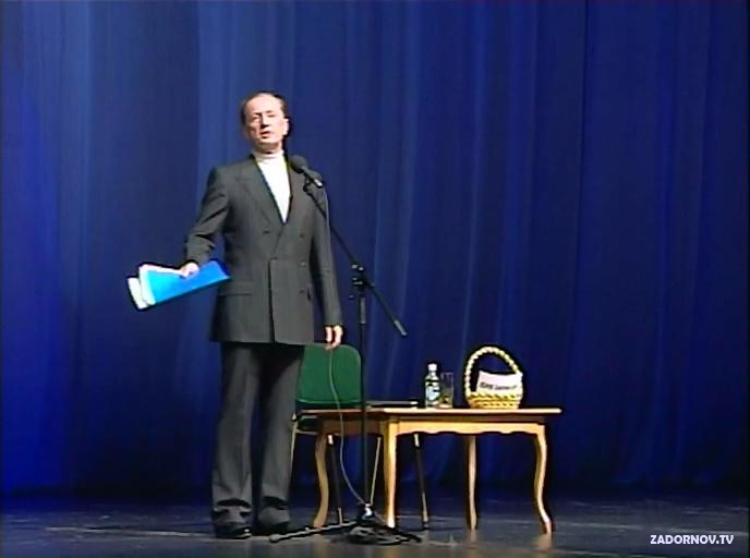Я буду говорить о том, что знаю и наблюдаю в России, потому что я все таки в Белоруссии не бываю, но вы смотрите наше телевидение, знаете все наши новости. Мне еще понравилось, в гардеробе бинокли предлагали некоторым, на что смотреть, я не совсем понимаю. Задорнов рассказал несколько случаев о том, как на его концертах звонил сотовый телефон и как он отвечал. Как одесситка предположила, что девичья фамилия у Задорнова Райтер. Выступление Задорнова под фонограмму и под голограмму. Меня часто задают вопрос, почему я часто критикую запад. Вот здесь в Белоруссии мне особенно это приятно говорить. Вот как я живу в Москве? Я быт взял чисто западный, а жизнь души оставил нашу, совдеповскую. Вот в России сделали все наоборот, мы жизнь души, которой там нет, взяли с Голливуда, а быт оставили наш совдеповский. Такая гремучая смесь у нас в России. То есть гамбургеры их, но засиженные отечественными мухами и сосиски германские, но вилки русские, знаете алюминиевые вилки, только у нас сохранились. Их в музей России сдавать надо, это рога из изюбрев в период битвы за самок. Вот еда. Чисто западная. Я думаю у вас Белоруссии тоже самое. Просроченные соки цвета недососонных леденцов. Яблоки в парафине. Эти западные арбузы наширявшиеся сахарным сиропом, синтезированные бульоны, клонированные сосиски, курицы трансвеститы, итальянская пицца, собранная из того, что не доели в Италии итальянцы. В Москве итальянская пиццерия и на витрине нарисованы две огромных пиццы, диаметр в рост человека и написано, кто съест две - третья бесплатно. Чеснок без запаха, джемы на которые не садятся даже мухи. Хрен немецкий не вызывающий слез, на такой хрен стыдно врага послать. За 70 лет советской власти мы соскучились по оберткам и упаковкам. По звучащим названиям "Морковка Кинг Сайз", Яблоки сэконд хэнд, блинчики свежие из Новой Зеландии. Нет чтоб с запада что до достойное, у них ведь есть хорошее качество. Они моются, они не пахнут в транспорте. Я понимаю почему там они моются, потому что у них есть там души, ванны. У нас куда не приезжаешь на гастроли, открываешь кран с холодной водой - обязательно горячая течет. Открываешь горячую - ржавая. И наш человек оправдывается - это полезное, это железо. Одна женщина говорит, что пьет воду только из под крана, потому что не хочет приучать к нежности желудок. В день, по московским каналам по ТВ 30 американских боевиков. Чихающие утопленники, оргазм в гробу. Фильм шел осенью под названием "Трахнутый". У моей знакомой две внучки 3 и 5 годиков, насмотрелись мультяшек западных, три поросенка, все поросята матерятся и бабушка целуя внучку на ночь, та ей говорит, бабушка не занимайся со мной на ночь любовью. Я включил как то телепузиков. Как их пучило. Но это действительно ужас. Один телевизионщик мне сказал, что снимают супер рейтинговую версию Красной шапочки, в ней, красная шапочка потомственная путана в третьем поколении, накормила волка педофила пирожками из расчлененной бабушки. Есть примета, если градус невежества у какого-то государства растет, это государство скоро будет воевать. Эта история готовит из молодежи пушечное мясо. А что наши пишут потом в сочинениях, мальчик написал в сочинении по Чацкому "Горе от ума", служить бы рад, прислуживаться тоже. А по Онегину девочка писал сочинение - Онегин произвел контрольный выстрел в Ленского. А еще один