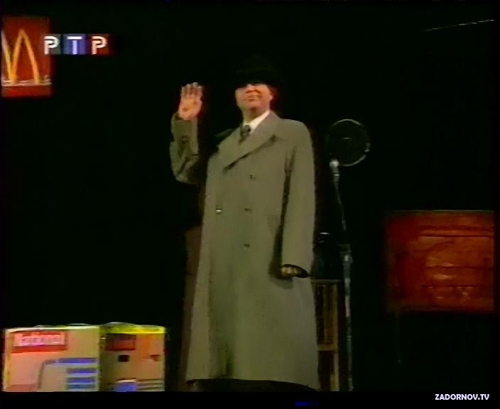 Выход с небольшой пародией на М.Горбачева в плаще, у которого медали на спине.